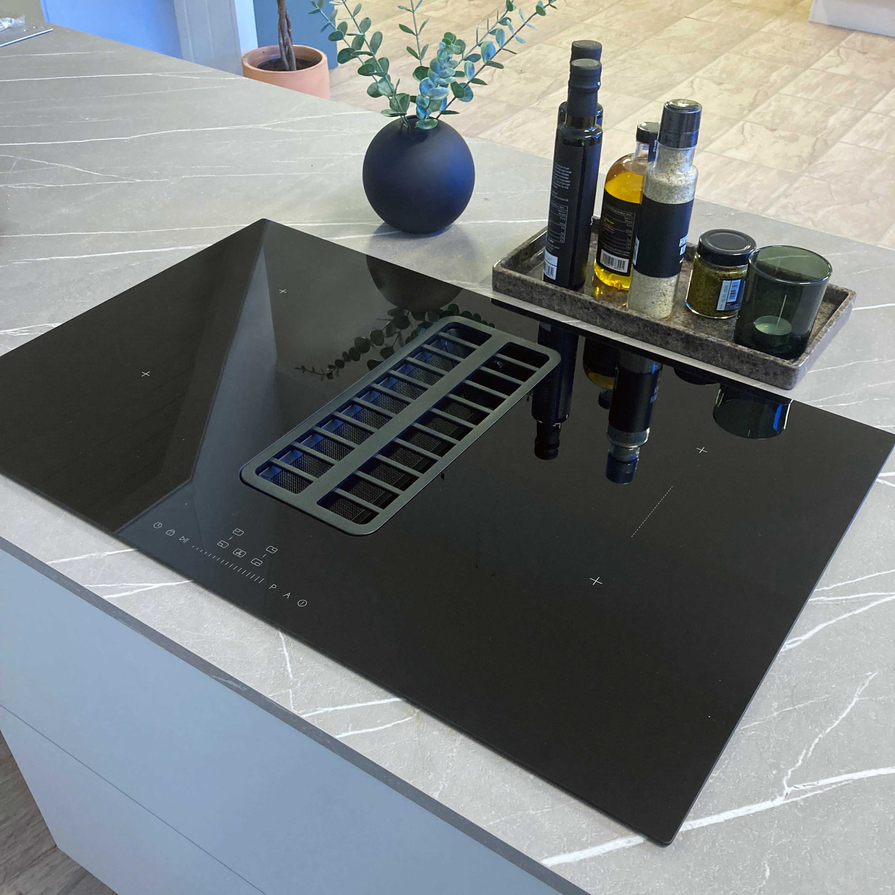 - Elegant kogeplade med emhætte og 9,5 m/s luftflow. Ekstremt lydsvag drift på 58 dB(A) ved maksimal sugestyrke. Energiklasse A+.