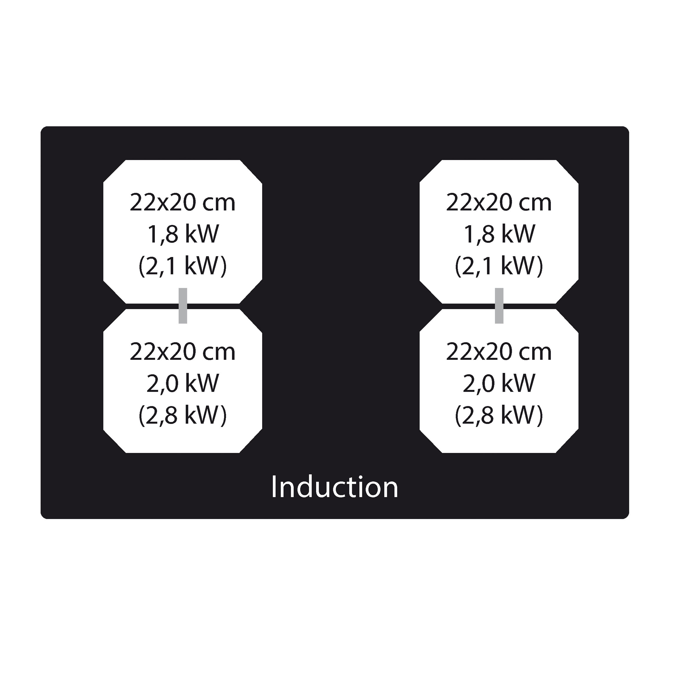 - Note: 2 kogezoner: 22 x 20 cm / 2.000 W (2.800 W) + 2 kogezoner: 22 x 20 cm / 1.800 W (2.100 W). Der er afrundede hjørner og modellen kan enten nedlægges eller integreres i bordpladen. Når det er vigtigt at kunne fokusere på madlavning, kan du aktivere Autoaspiration funktionen. Emhættens sugestyrke justeres automatisk afhængig af antallet samt effekten af de kogezoner, som er i brug.
