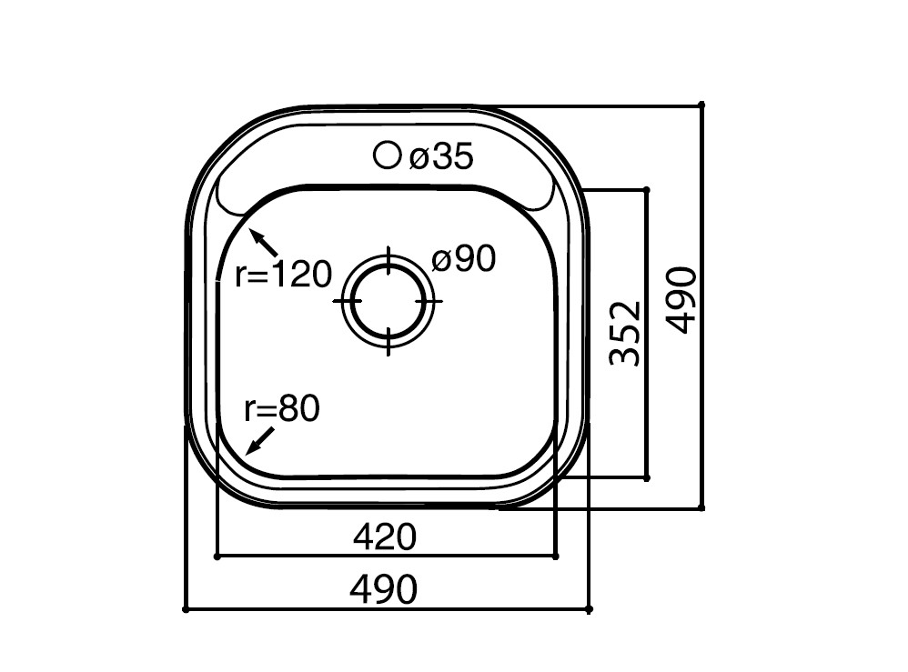 m/hul center, Stålvask, Enkelt kumme med bagkant. For under- eller planlimning - Rustfrit stål
