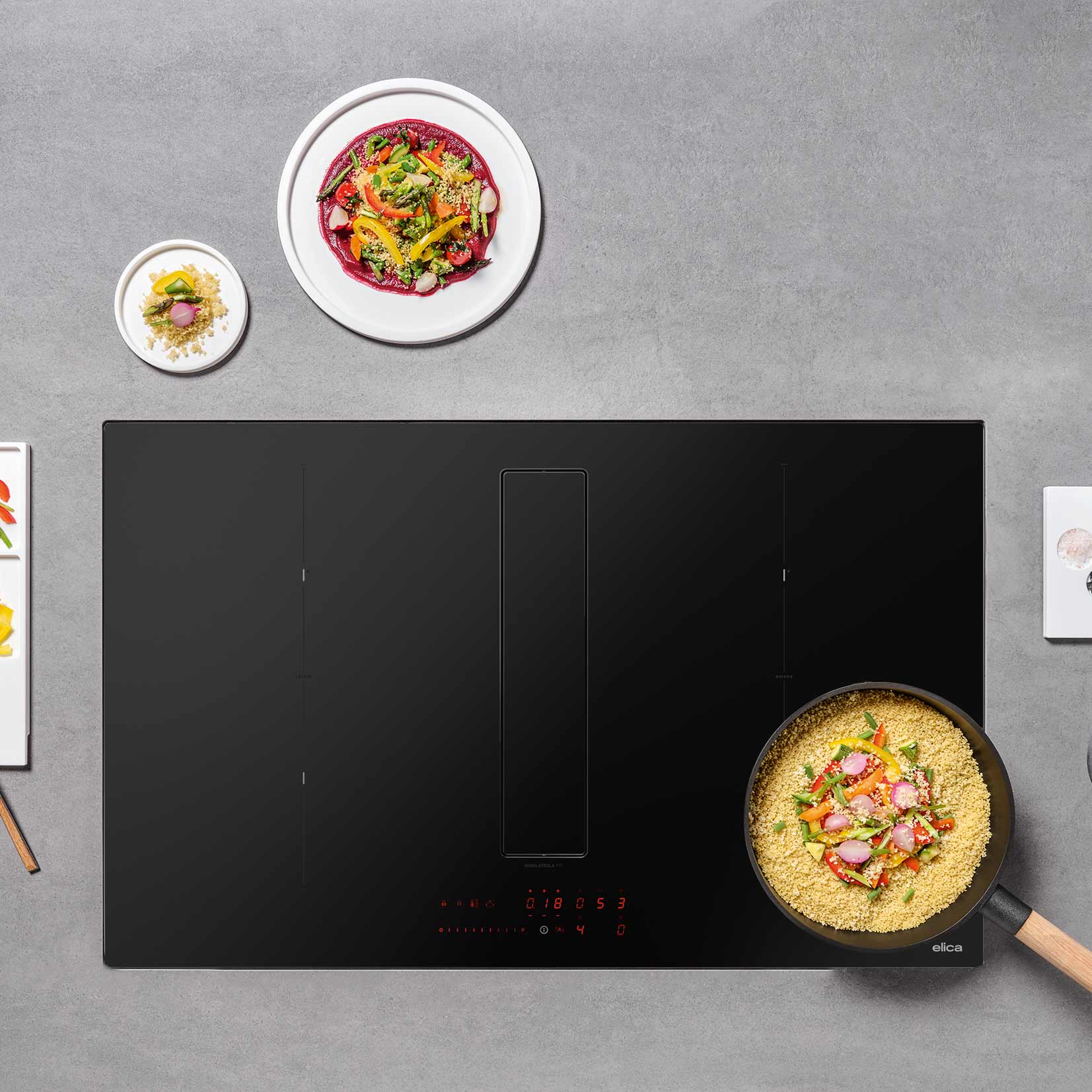 - 83 cm kogeplade med emhætte i RAW-glas. 5,1 m/s luftflow og ekstremt lydsvag drift på 61 dB(A) ved max. sugestyrke.
