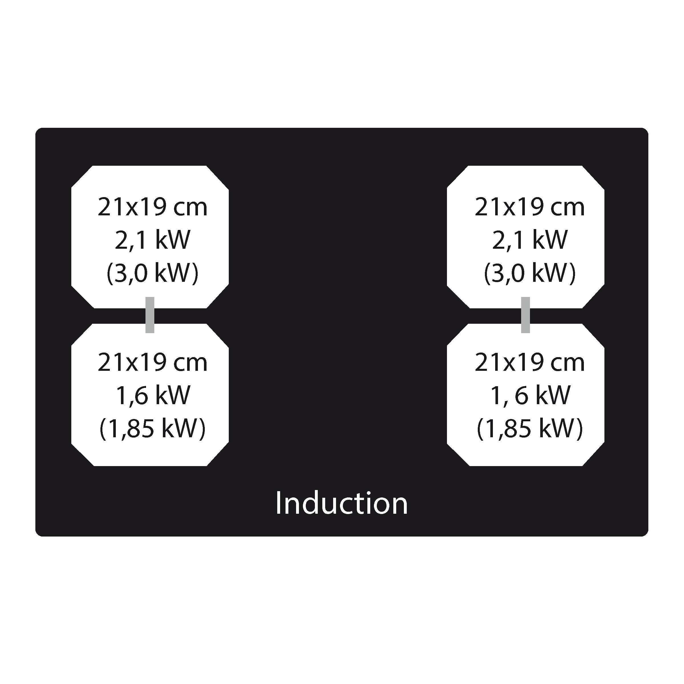 - Note: 2 kogezoner: 21 x 19 cm / 2.100 W (3.000 W) + 2 kogezoner: 21 x 19 cm / 1.650 W (1.850 W). Rørføring medfølger ikke. Må købes separat. Der er afrundede hjørner og modellen kan enten nedlægges eller integreres i bordpladen. Når det er vigtigt at kunne fokusere på madlavning, kan du aktivere Autocapture-funktionen. Emhættens sugestyrke justeres automatisk afhængig af antallet samt effekten af de kogezoner, som er i brug.
